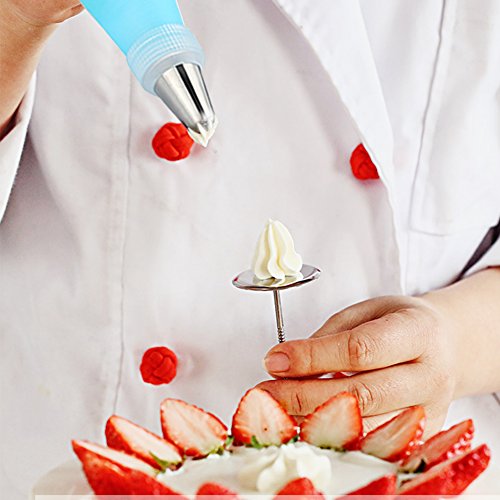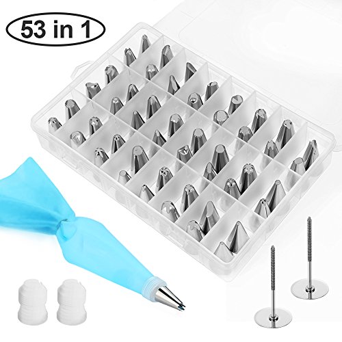 - Cake Decorating Supplies kit: 48 stainless steel icing tips, 1 reusable silicone pastry bag, 2 flower nails and 2 reusable plastic couplers. All these in a durable storage case to help you organize and carry.