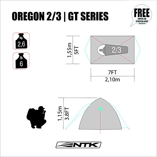 NTK Oregon GT 2 to 3 Person 5 by 7 Foot Outdoor Dome Family Camping Tent 100% Waterproof 2500mm, Easy Assembly, Durable Fabric Full Coverage Rainfly - Micro Mosquito Mesh for Maximum Comfort
