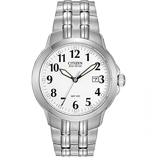 -. Feature : Stainless Steel Watch with Round Dial Featuring Easy-to-Read Hour Markers, Sword-shaped Hands, and Link Bracelet / Japanese Quartz Movement with Analog Display / Eco Drive Technology is Fueled by Light and It Never Needs a Battery / Features Fold-Over Push-button Clasp with Safety Closure, Date Window, and Protective Mineral Crystal Dial Window / Water Resistant WR100/10Bar/333ft