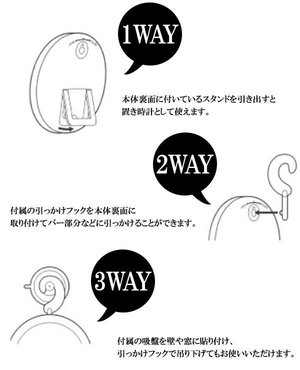 防水仕様で、スタンド・吸盤・フックという3つの方法で設置が可能ですので、どんなバスルームにも対応できます。文字盤が大きめなので視認性に優れています。 |