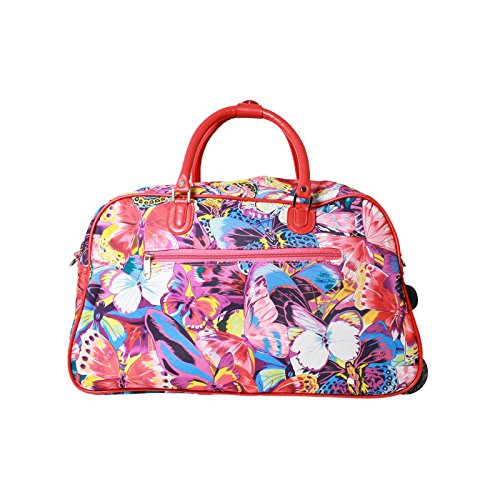 -. Binding : Apparel -. Brand : World Traveler -. Feature : Front zipper secured pocket and interior pockets for organization / EVA Polyester construction, top zipper opening / Adjustable ergonomic shoulder strap, internal retractable handle system, in-line skate wheels / Dimensions: 12 in H x 11 in W x 21 in L - 4.8 lb / 21x11x12 -. Label : World Traveler -. Manufacturer : World Traveler -. PackageQuantity : 1 -. ProductGroup : Apparel -. ProductTypeName : BAG -. Publisher : World Traveler -. Studio : World Traveler -. Title : World Traveler Butterfly Tattoo 21" Rolling Duffel Bag - Pink Trim Butterfly Rolling Duffel