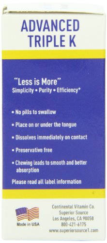 -. Binding : Health and Beauty -. Brand : Superior Source -. EAN : 0076635904808 -. Feature : Our instant dissolve micro lingual tablets go to work fast, under the tongue / Dissolve one micro lingual tablet under the tongue daily / May also be swallowed as you would a regular tablet -. IsAdultProduct : 0 -. Label : Superior Source -. Manufacturer : Superior Source -. Model : 076635904808 -. MPN : 076635904808 -. NumberOfItems : 1 -. PackageQuantity : 1 -. PartNumber : 076635904808 -. ProductGroup : Health and Beauty -. ProductTypeName : HEALTH_PERSONAL_CARE -. PublicationDate : 2013-03-31 -. Publisher : Superior Source -. ReleaseDate : 2013-04-10 -. Studio : Superior Source -. Title : Superior Source Triple K Nutritional Supplements, 30 Count -. UPC : 076635904808