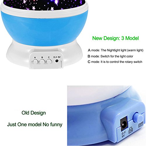- Newest Generation: 1.5 Meter USB Cord. There are 4 pcs LED Beads of warm light, blue light, green light, red light. They are match with 3 Push-Button (A B C). The night light star projector has eight modes of operation that include blue, red, green and flashing mode. It displays an amazing display of moon and stars on the ceiling of the bedroom, and has an optional setting for rotation or no rotation as well.