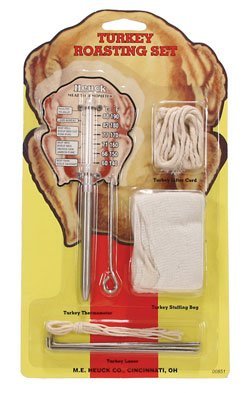 Make sure this years Thanksgiving turkey comes out absolutely perfect using this turkey roasting kit. This set includes an armored meat thermometer, a no-sew turkey lacer, a turkey lifter (also ideal for roasts), and a turkey stuffer bag, as well as in depth directions on how to use them all. In addition, this kit also includes a roasting time and temperature chart and a Hueck's famous poultry dressing recipe. Tremendous value for a low cost!!Feature