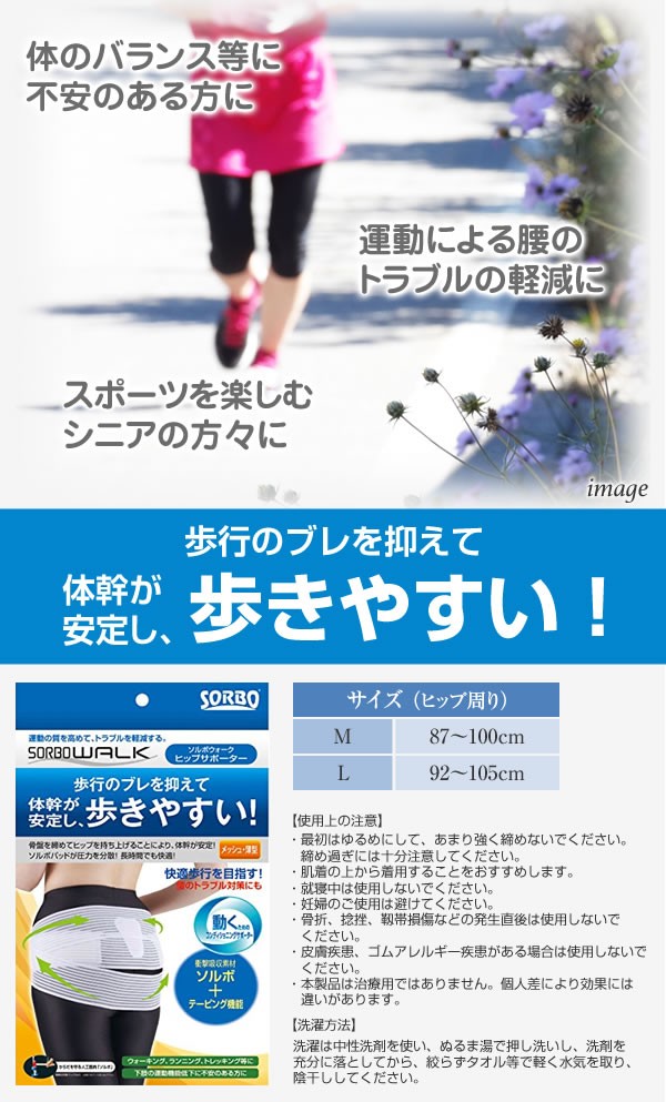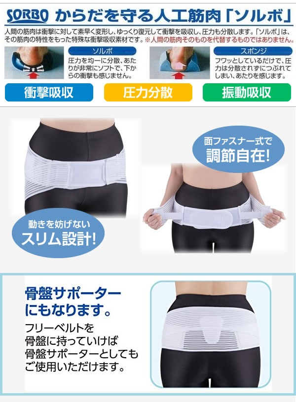 | 3本のメッシュベルトで腰をしっかりサポート、ソルボヒップパッドで筋力を補助することで歩く姿勢が安定。腰への負担がかかりにくくなります。ベルトの締め付け具合もワンタッチで調節自在。フリーベルトの位置を変えれば、骨盤サポーターとしてもお使いいただけます。 |