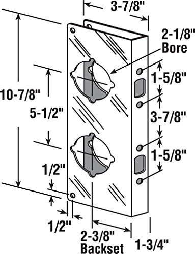 -. Feature : Used to reinforce and repair doors to aide in preventing forced entry / Fits 1-3/4 in. thick doors, 2-1/8 in. bores, 2-3/8 in. backset, 5-1/2 in. hole centers, 3-7/8 in. width x 10-7/8 in. height / Classic bronze finish / Brass construction