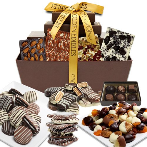 -. Feature : Each Basket is overflowing with Artisan Crafted Belgian chocolate covered treats. / Your gift contains: -12 Classic Belgian Chocolate Covered Sandwich Cookies -6 Belgian Chocolate Covered Nutter Butter Cookies -6 Belgian Chocolate Covered Graham Crackers- Half Pound Belgian Chocolate Covered Dried Fruit Variety -3 oz. Pistachio & Cranberry Bark - 3 oz. Cookies and Creme Bark -3 oz.Dark Chocolate Almond Bark -3 oz. Pretzel Caramel Bark - 6 Truffles / Arrives in an elegant gift box perfect for giving with your personalized gift message; Gift option available in checkout. Arrives in a 12"x9"x8" outer box. / Gourmet Gift perfect for Mother's Day, Birthdays, Anniversary, Congratulations, and Christmas / Since these gourmet treats are made in our small batch gourmet kitchen, designs will vary. No two will be exactly the same.