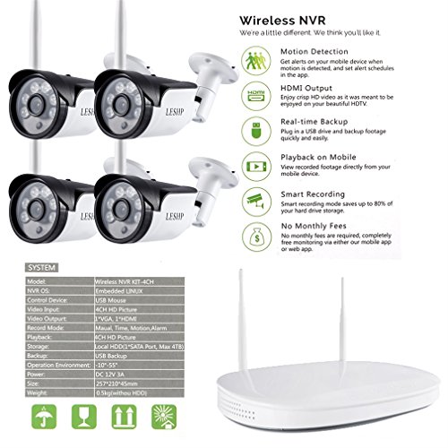 - ♪What You Get:1 X 4CH WIFI NVR(No HDD included).4 X 720P HD WIFI IP Camera.5 sets X Power adapter.4 bags X Installation Screws. 6pcs X WIFI antennas(2pcs for NVR, 4 PCS for camera).1 X Quick Installation Manual.1 X USB Mouse.1 X Cable.