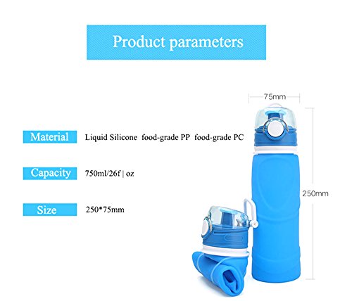 -. Binding : Misc. -. EAN : 0723610477764 -. Feature : Healthy and Safe: made of medical grade silicone; 100% BPA-free, non-toxic and odorless; approved by FDA in the U.S.; safe and eco-friendly. / Large Capacity but Lightweight:750ml Volume and only 160g, allows you to carry conveniently. / Innovative Design: foldable and portable, easy to roll up and fit inside a bag. / Leak-proof: designed with a double lid to serve as leak proof. Silicone gasket is on the top and a leak proof valve in the lid will prevent a spill. / Heat Resistant: endures a wide range of temperature from -40°C to 100°C (-40~212°F). -. IsAutographed : 0 -. IsMemorabilia : 0 -. Label : JLER -. Manufacturer : JLER -. ProductGroup : Sports -. ProductTypeName : SPORTING_GOODS -. Publisher : JLER -. Studio : JLER -. Title : Collapsible Silicone Water Bottle - Foldable Medical Grade Silicone BPA Free with Leak-proof Valve for Travel Sport Outdoor Activities 26oz/750ml(Blue) -. UPC : 723610477764