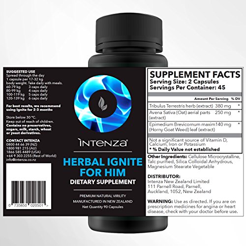 -. Feature : IMAGINE YOURSELF WITH MORE SEXUAL ENERGY, CONFIDENCE AND STAMINA - Increased libido, stronger & longer erections, to enjoy better love life with reduced stress & more happiness. Our customers tell us how Herbal Ignite has completely changed their lives by improving romance and happiness. / 100% NATURAL YET POTENT HERBAL FORMULA - We use 3 key herbs to ensure you get the best results including: Horny Goat Weed for increased sexual desire and sexual satisfaction. Tribulus Terrestris for rejuvenating sexual performance, natural testosterone support, increased libido, more energy, confidence and stamina. Avena Sativa, also known as wild oats, for stress and fatigue relief, to increase strength and also support testosterone & libido in men. / MADE IN NEW ZEALAND in cutting edge FDA Registered manufacturing facilities, made to the highest standards with thorough testing and quality control. We guarantee no adulteration or undeclared ingredients. Rest assured you are only receiving premium quality, all-natural ingredients. / #1 MARKET LEADER FOR 20 YEARS in New Zealand for 100% natural sexual health supplements. Proven product with tens of thousands of satisfied and happy customers. / WHY CHOOSE HERBAL IGNITE FOR HIM? It's proven over 20 years, safe, natural ingredients, it is GMO free, preservative free, sugar free, milk free, starch free, wheat free, yeast derivative free, gluten free and dairy free. Feel confident that you know exactly what is inside each of the 90 capsules. It supports libido, stronger erections, strength and underlying causes of why men may have less interest in sex like improving energy and reducing stress and fatigue.