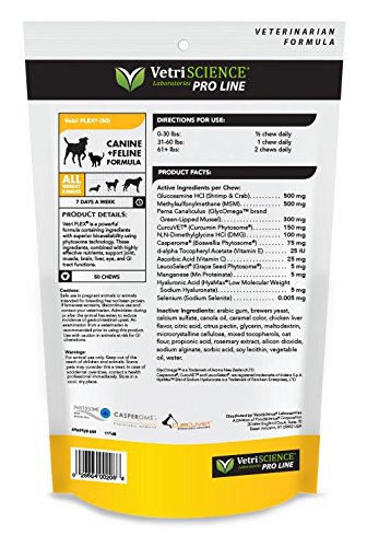 VetriFLEX supports muscle, liver, brain, eye and GI tract functions. Directions for use: 0 -30 pounds: 1/2 chew daily, 31- 60 pounds: 1 chew daily, 61 pounds and over: 2 chews dailyFeature