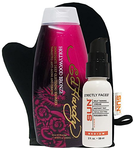1. Ed Hardy Hollywood Bronze Bronzer Tanning Lotion, 10 oz1. Sun Laboratories Strictly Faces Dark 2.7oz1. Sun Laboratories Tanning MittSun Laboratories was established in 1983 and is family owned and operated. It is a company built on the premise of creating a line of beauty products that utilizes an easy application process as well as resulting in glowing skin, free of harmful rays from the sun. 1)Elbow, knees, and knuckles generally have dryer skin. Therefore, those areas will absorb more sunless tanner for legs and arms. To avoid this, apply a small portion of hand and body lotion to those areas. Your skin will not be able to absorb the sunless tanning product very well and that's what you want in these areas. 2)If you use before and after stickers, put them anywhere on the body before applying. 3)Put on your tanning glove that comes with this product. 4)When applying the overnight self tanner, rub in a circular motion to avoid streaking. 5)After application, wait a minimum of five hours before showering or getting in the pool. 8 hours for optimal results. 6)The self tanner has a cosmetic bronzer to give you a visual of where you have applied it. While showering, you will notice the cosmetic bronzer will wash off, leaving behind the true self tanning color. 7)Color will continue to develop even after the eight hour period after the application.