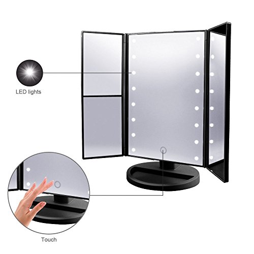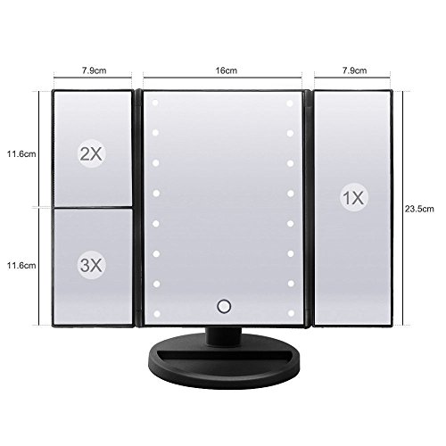 Lighted Makeup Vanity Mirror, Tri-Fold Illuminated Cosmetic Mirror with 3X/2X/1X Magnification, Rechargeable Led Light Tabletop Mirror with USB Cable, 21 Super Bright LED (Black)