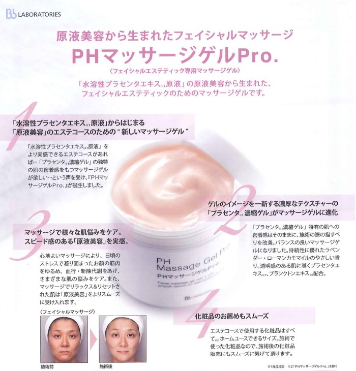 「水溶性プラセンタエキス原液」をより実感できるエステコースがあれば・・・「プラセンタ濃縮ゲル」の独特の肌の密着感をもつマッサージゲルが欲しい・・・という声を受け、「pHマッサージゲルPro」が誕生しました。