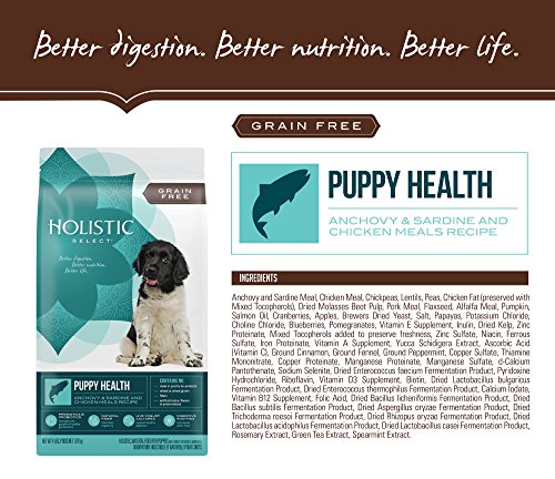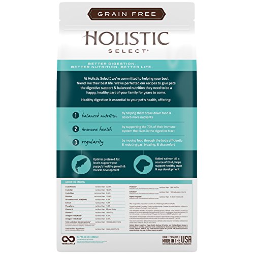 Holistic Select puppy formula is formulated to meet the unique nutrition needs of your growing pet. Grain-free, with added ingredients to support healthy development plus prebiotics & probiotics, live yogurt cultures, digestive enzymes, and natural fiber these recipes enhance digestion and total body health.