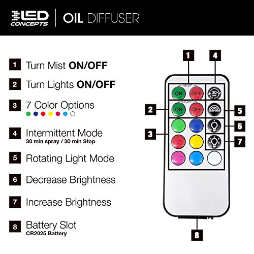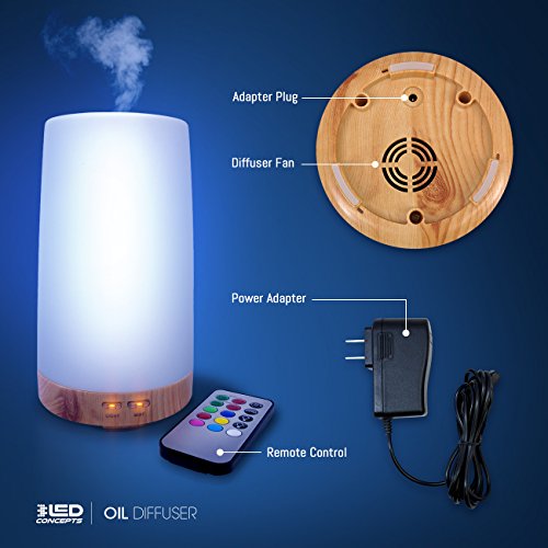 Keep the balance and harmony of your mind, body, and soul. Escape to a place that brings tranquility from the comfort of your home with the LED Concepts Essential Oil Diffuser and Cool Mist Humidifier. This incredible diffuser releases cool mists of vaporized essential oils to revive your mind, body, and soul. It eliminates odor from tobacco, cooking, pets, etc. with a constant inviting fragrance. 7 color changing LED light modes feature rotating and solid settings with a push of a button! Elevate your health or mood when you're feeling gloomy, or set the vibe during a special occasion. Use common scents! Create the ultimate ambiance in your home or business. Create a welcoming aosphere at home for guests or potential homebuyers with simple, clean scents to ensure a pleasant long-lasting impression. Allow the soft glow in your child`s bedroom ease the night-time anxiety or soothe a common cold. Spark a romantic aosphere with your special someone with hints of rose or jasmine for a cozy night in. Pack an electric diffuser on your next vacation or business trip. Lavender aromas are sure to relieve the stressful demands of the workplace! Enjoy aromatherapy without the risks associated with incense or candles. Advanced ultrasonic vapor technology fills your space with safe, long lasting aromatherapy. Operate by using the diffuser unit or the remote control. To use, take off the upper cover, plug in the adapter, add water with your favorite essential oils, and replace the cover.Feature