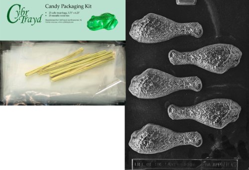 Cybrtrayd Drumstick Miscellaneous Chocolate Candy Mold with Packaging Bundle of 25 Cello Bags, 25 Gold Twist Ties and Chocolate Molding Instructions