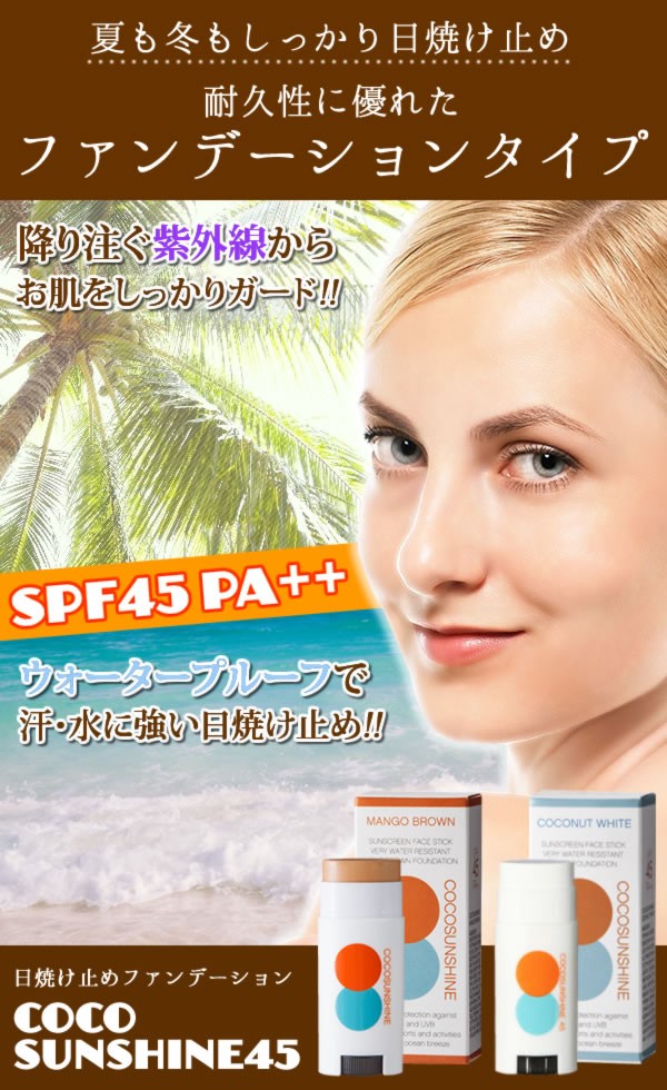 | <h1>耐久性に優れた日焼け止め『ココサンシャイン』のファンデーションタイプ。汗や水に強いウォータープルーフのスティック型日焼け止めで、降り注ぐ紫外線からお肌をしっかりガードします。マンゴーブラウンはスポーツ時だけでなく日常のファンデーションとしても重宝します。ココナッツホワイトは定番ホワイトカラーにココナッツの香りをプラスした夏らしい日焼け止めです。男女兼用でお使いいただけます。</h1> |