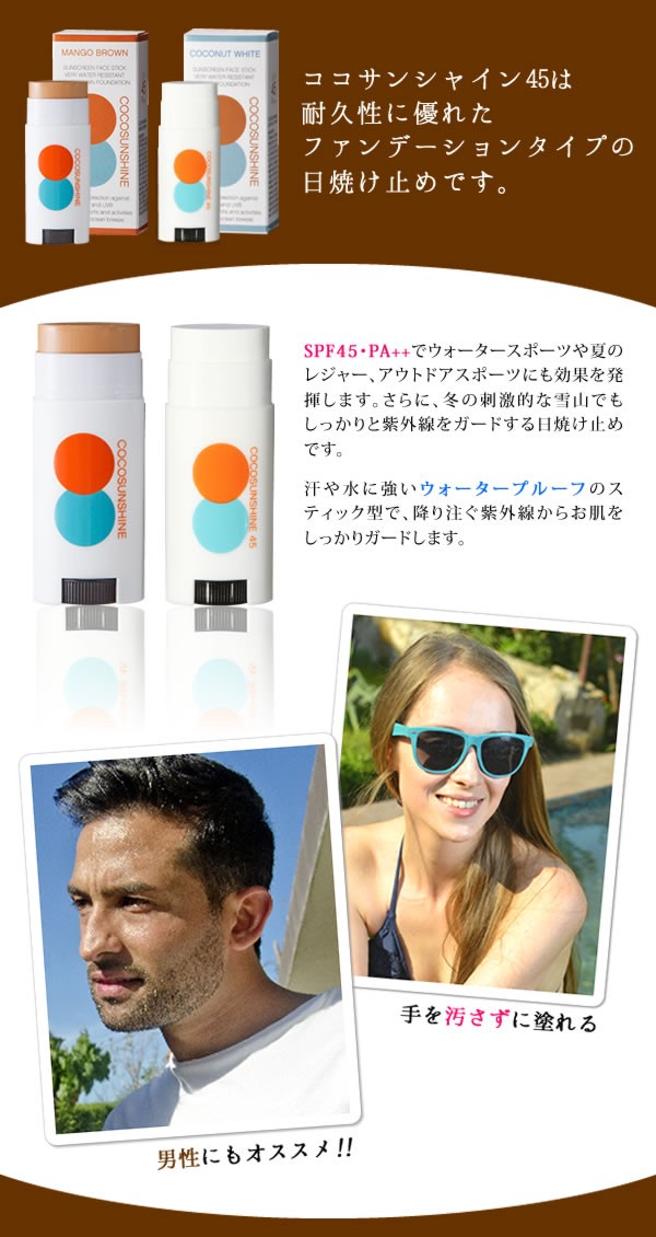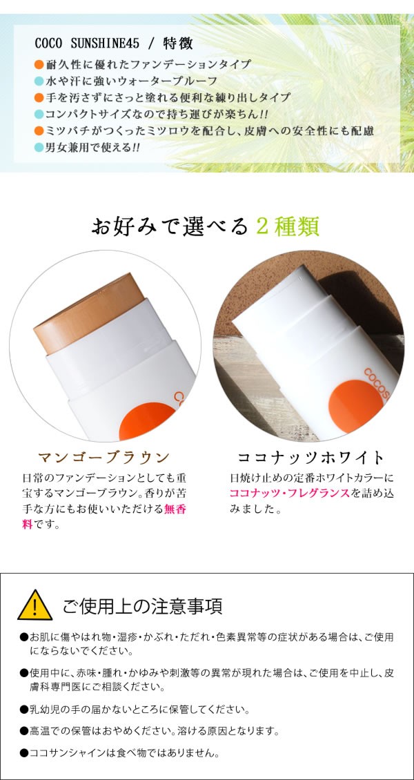 | 耐久性に優れた日焼け止め『ココサンシャイン』のファンデーションタイプ。汗や水に強いウォータープルーフのスティック型日焼け止めで、降り注ぐ紫外線からお肌をしっかりガードします。マンゴーブラウンはスポーツ時だけでなく日常のファンデーションとしても重宝します。ココナッツホワイトは定番ホワイトカラーにココナッツの香りをプラスした夏らしい日焼け止めです。男女兼用でお使いいただけます。 |