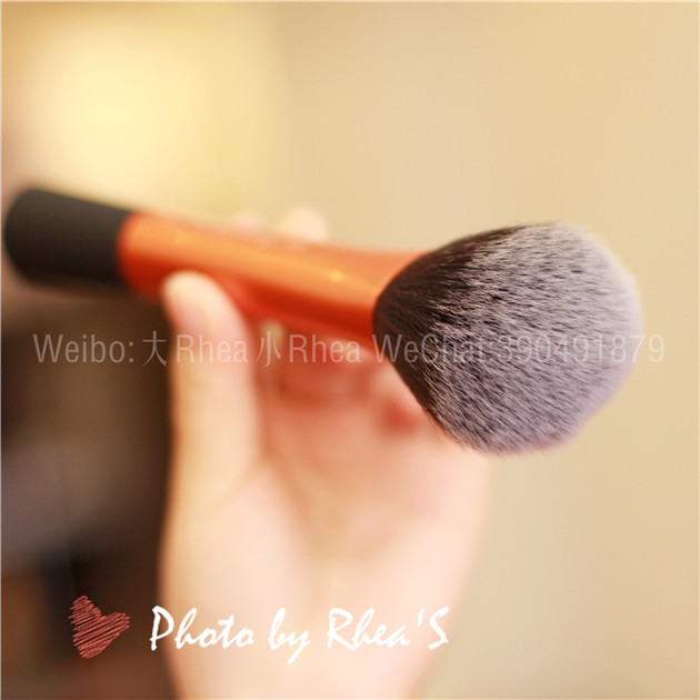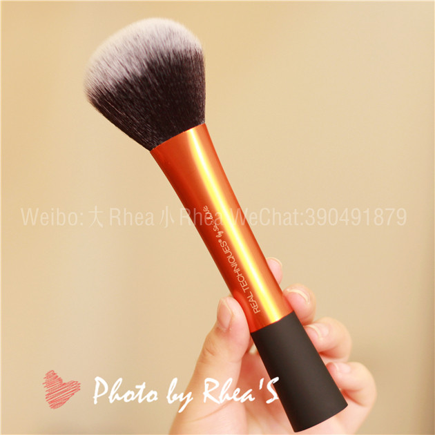 正当土豪金的热潮席卷全球之时~~R替家族中最重磅的Powder Brush也越来越火!之所以说它最重磅,是因为它是里面体型是最大的。在我看来简直就是RT系列里的金箍棒!手感非常的好!!刷毛近圆形扁口的,但是刷毛毛量真心够多。刷毛的手工剪裁又一次向我们展现了它的美好!舒服到极致,业界顶尖的波斯毛做的!绝对不掉毛~~顶部平实有力,外部层层递进,完美贴合脸部线条~~!毛量充足、厚实的真是散粉、蜜粉的绝佳好伙伴。这款我认为是必入款! 再说回来触感方面。这把刷子真是上脸之后很柔很舒服!我有个朋友算是个天生的环保人士,因为她天生动物毛过敏...冬天不能穿毛衣,羽绒服不能带毛毛,化妆刷更是不敢随便上脸...她总看我拿着细光锋啊、灰鼠毛啊在脸上蹭来蹭去的羡慕嫉妒恨之极。powder brush让她终于有机会体验刷子的美好,理解我们口中的清风拂面了~~!RT全套系列绝对是敏感、爱敏感皮姑娘的救星啊!无可挑剔的一把散粉刷,RT中的金箍棒,大家一起来分享吧~~!! 这款做散粉刷、蜜粉刷绝对的够大够蓬松!!切记散粉刷一定要选择毛大并且蓬松的,全脸两下搞定才叫好!!不然散粉会堆积在一起完全失去了散粉定妆淡淡的效果~~