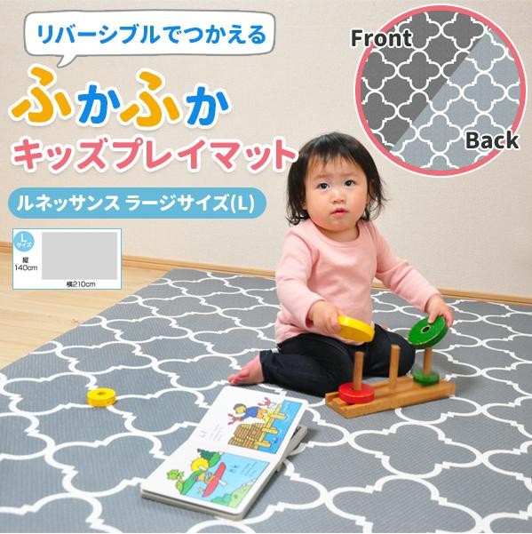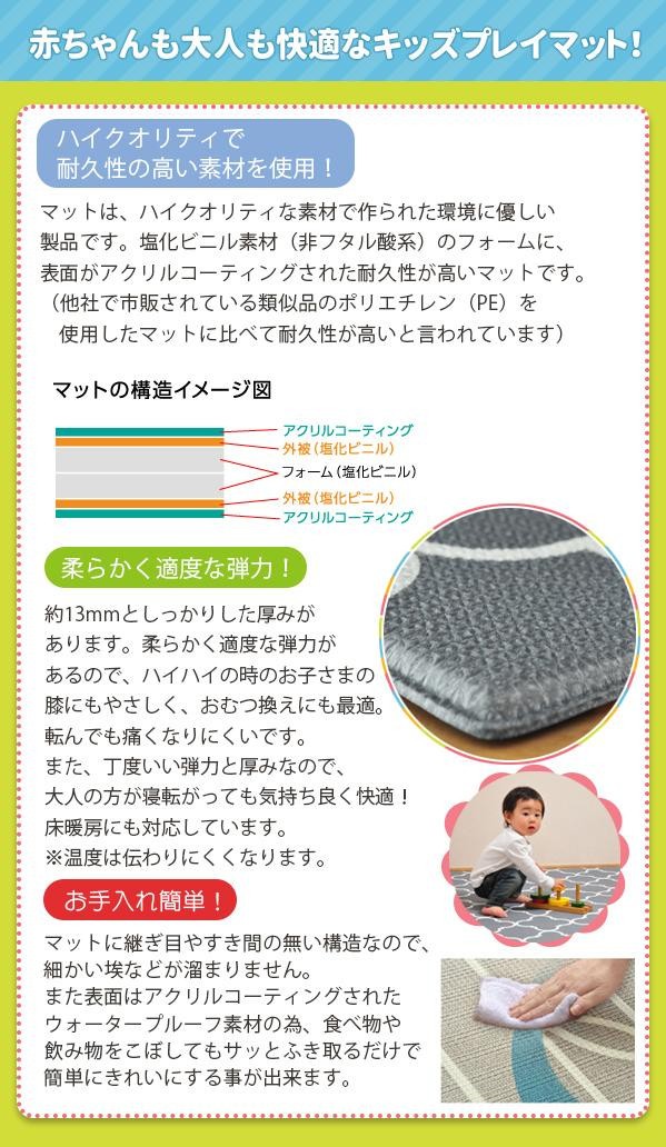 やわらかく適度な弾力があり、ハイハイ時の赤ちゃんの膝にも優しく、ころんでも痛くなりにくいふかふかマットです。お母さんにとってもおむつ替え時など快適に行えます。裏表の色が違うので、気分に合わせてリバーシブルに使用することが可能!!シックなデザインでリビングに敷いても違和感が有りません。ウォータープルーフ素材を使用しているので、お手入れも簡単です♪ |