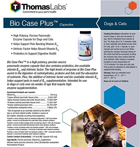 -. Binding : Misc. -. Brand : Thomas Laboratories -. EAN : 0725068920120 -. Feature : A quality pancreatic enzyme supplement made from whole, raw porcine pancreas / With added Vitamin B-12 and probiotics to help stabilize healthy levels of gut bacteria / Provides what pets need for pancreatic enzyme disorder -. Label : Thomas Laboratories -. Manufacturer : Thomas Laboratories -. MPN : 110-0150.C05 -. PackageQuantity : 1 -. PartNumber : 110-0150.C05 -. ProductGroup : Pet Products -. ProductTypeName : PET_SUPPLIES -. Publisher : Thomas Laboratories -. Size : 180 count bottle -. Studio : Thomas Laboratories -. Title : Thomas Labs Bio Case Pro V (180 capsules) -. UPC : 725068920120