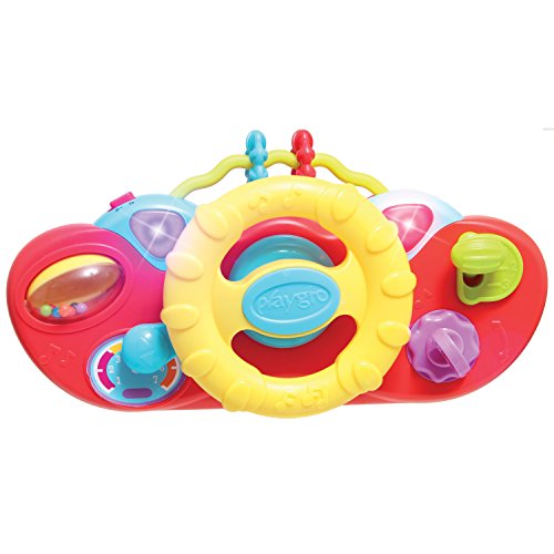 The Playgro Jerry's Class Music Drive & Go is sure to amuse with a squeaker horn and indicator sounds to stimulate auditory development. The gears and twisting, spinning features will stimulate your baby's fine motor skills. The colorful textured rings help relieve pain from teething while crinkle sounds encourage tactile play. Velcro straps make it easy to attach to strollers and more!