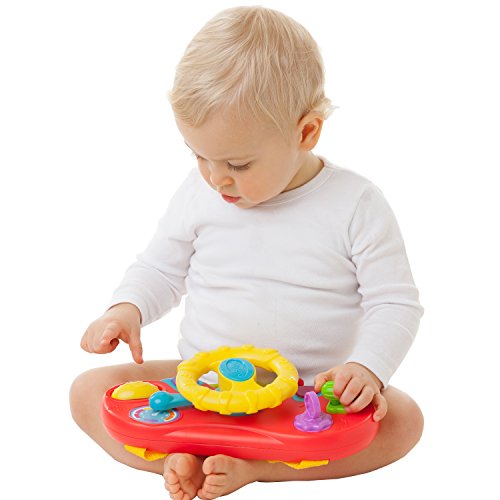 Steering wheel turns while the horn squeaks and indicators make sounds, assisting bilateral hand coordination development