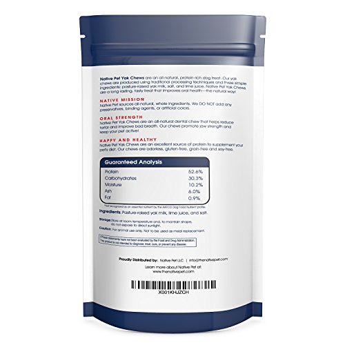-. Feature : ALL-NATURAL & SIMPLE INGREDIENTS: Native Pet's yak chews are produced using traditional processing techniques and 3 simple ingredients: pasture-raised yak milk, salt, and lime juice. / GLUTEN FREE & LACTOSE FREE: Our delicious chews are naturally gluten free and lactose free, providing a treat that's gentle on sensitive stomachs. / PROMOTES ORAL HEALTH: Native Pet's dental chew is a hard treat that encourages active chewing, which reduces tartar and improve oral hygiene. / PROTEIN RICH & LONG-LASTING: Our yak chews are packed with nutrients, provide a healthy source of protein, and keep your dog chewing for hours! / 100% SATISFACTION GUARANTEED: Try out Native Pet risk-free! If you aren't satisfied, we will fully refund your purchase, no questions asked!