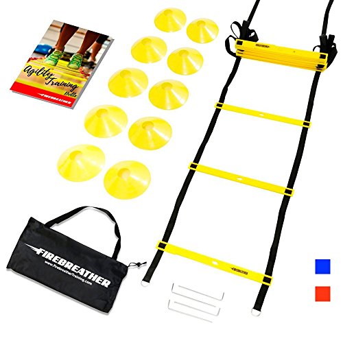 AGILITY LADDER & CONES by FireBreather. Powerful Training Equipment to Boost Performance and Cardio in Soccer, Football & Sports. Set of 15ft Speed Ladder, 10 Cones, Pegs, Carrying Bag & E-Book
