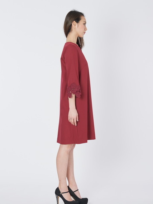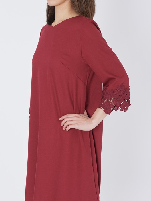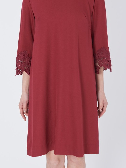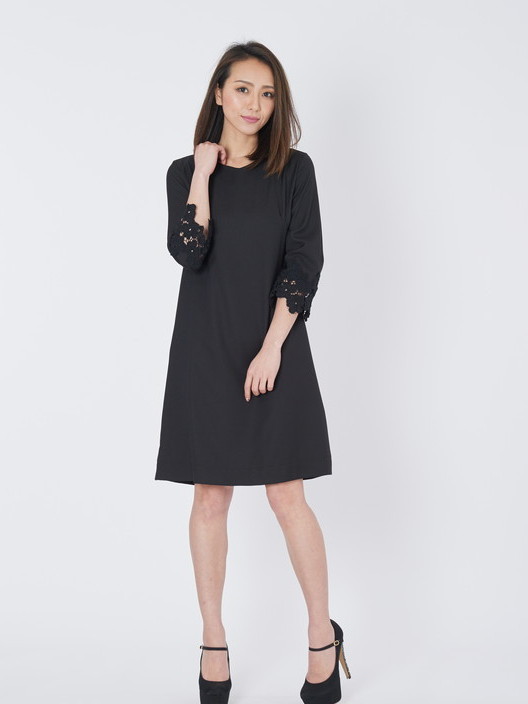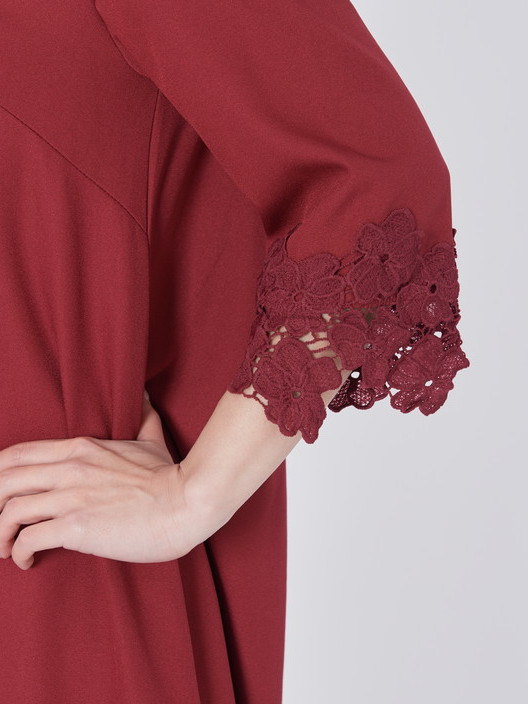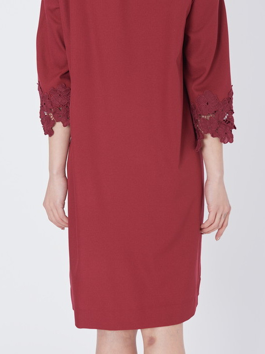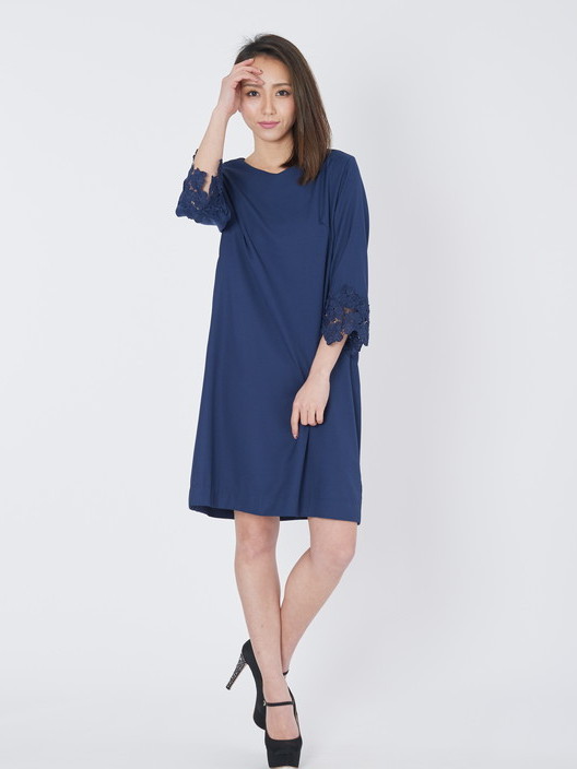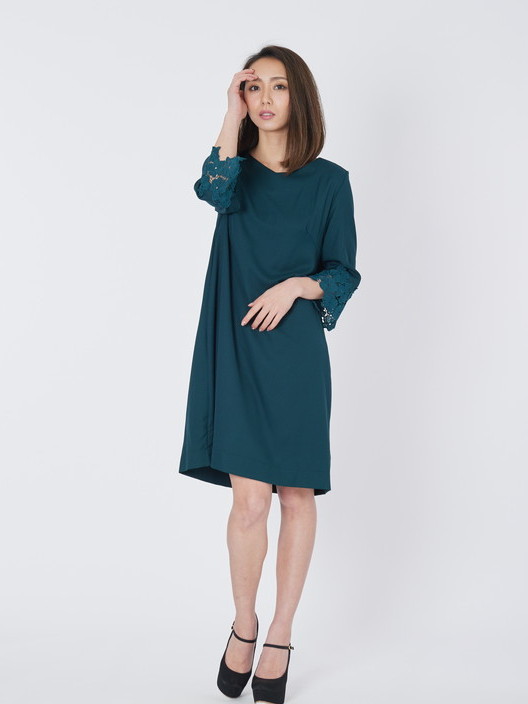 袖口のレースが上品さを与えてくれるAラインのパーティードレス!!滑らかな質感の素材はとても着心地がよく、程よい抜け感のあるシンプルなフレアーシルエットは女子力を上げてくれるとても優雅で印象的なレース袖ワンピースです