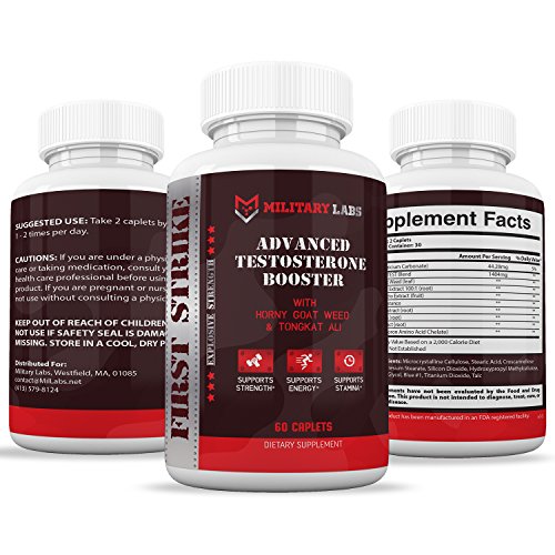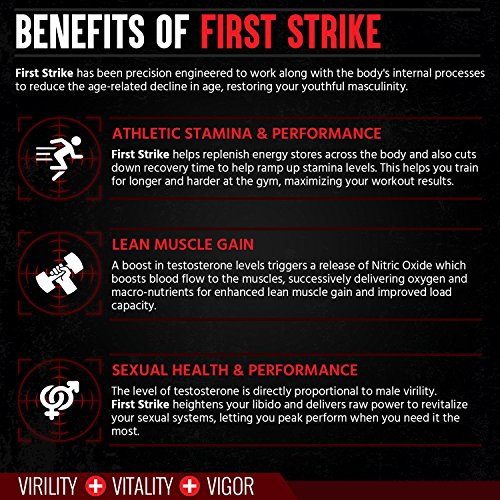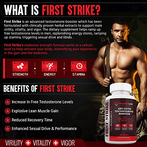 Reclaim your vital strength, energy and vigor by replenishing your Testosterone with Military Labs First Strike! First Strike hits fast, delivering the perfect payload of natural testosterone boosters to give you the results you need. When men start to hit the age of the 30, their natural testosterone production is on the decline. Not to mention that due to our modern sedentary lifestyle, testosterone levels are at an all-time low. This leaves many with some adverse effects, Which symptoms do you exhibit? (low energy, decrease in libido, poor sexual performance, difficulty to put on muscle or to burn fat, insomnia, low confidence/self-esteem, depression) All of these may be caused by low testosterone levels. This is why many are turning to natural testosterone supplements to reclaim what was lost and now you can too with First Strike! Safe, Powerful and Effective, Manufactured and designed to help boost and maximize your natural testosterone levels, First Strike acts as a natural testosterone booster that will help you reap the benefits of healthy optimal Testosterone levels: By restoring your energy levels, your confidence, your libido, and many other things associated with healthy levels - you will soon feel renewed and restored. First Strike is a powerful testosterone booster for men. Some have considered it the best Natural anabolic enhancer they have ever used! Designed to naturally increase testosterone levels without any side effects. Product Details: - Safe and Natural Ingredients - Fortifies and Replenishes Testosterone - Serving: 2 Capsules Daily With A Meal - Athletic Stamina and Performance - Lean Muscle Gain - Enhances Sex Drive - Great For Bodybuilders We are committed to bringing you clean healthy products. That's why we have formulated this supplement with natural ingredients, such as: -Horny Goat Weed -Tongkat Ali -Nettle Root Extract -More! 0 |