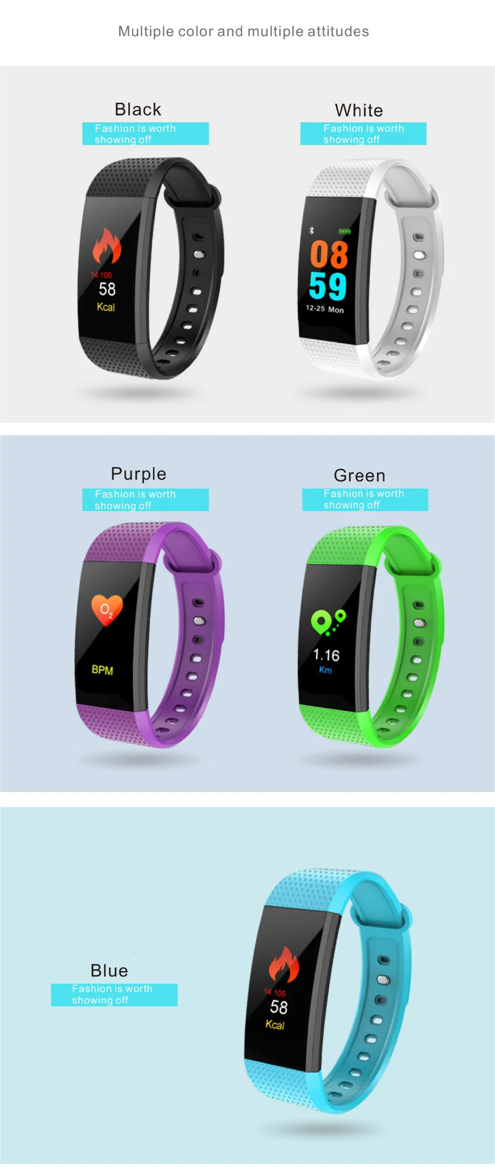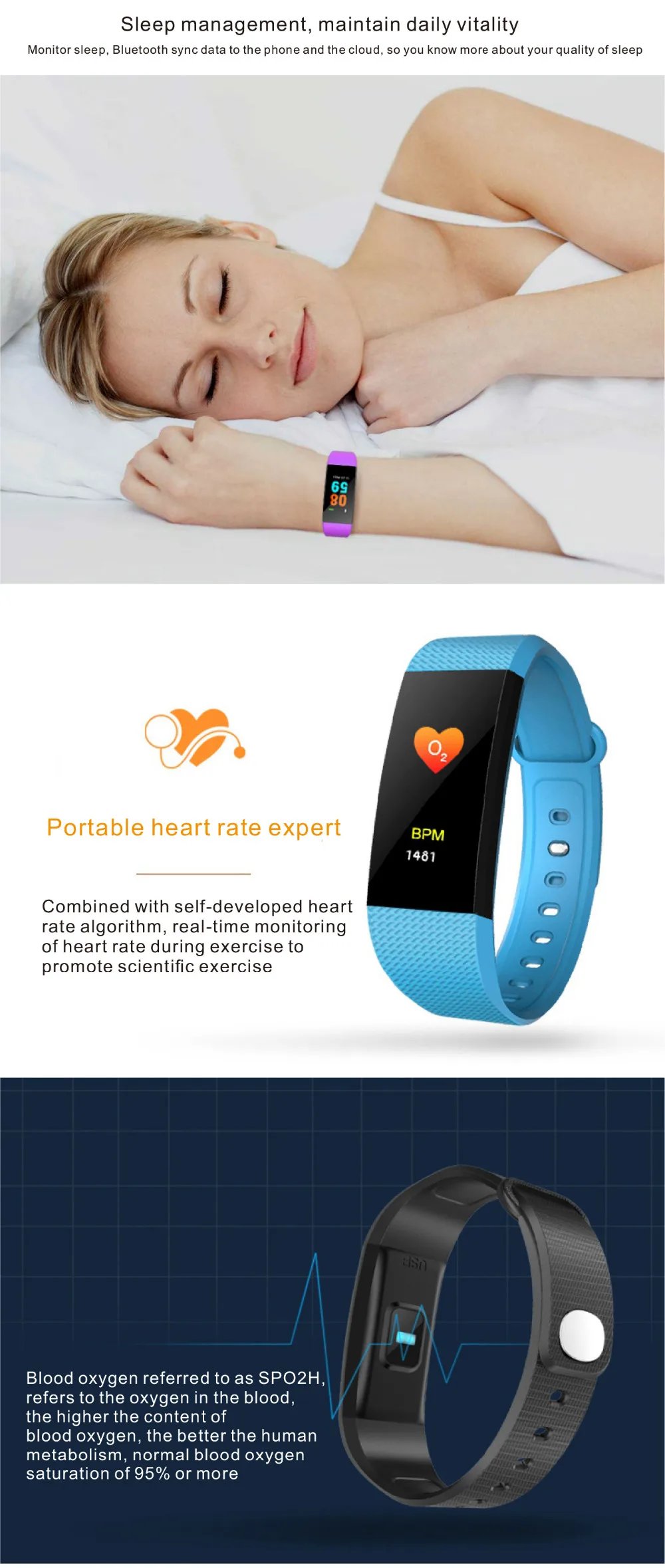 Function:Message Reminder,Passometer,Activity Tracker,Fitness Tracker,Blood Pressure,Call Reminder,Remote Control,Sleep Tracker,Heart Rate Tracker,Social Media Notifications