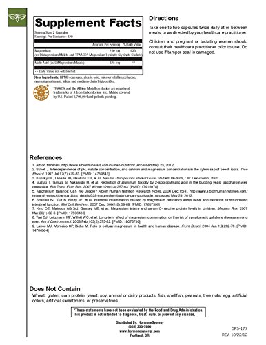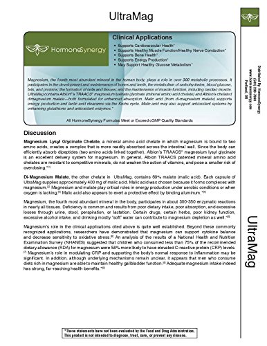 -. Binding : Health and Beauty -. Brand : HormoneSynergy -. EAN : 0780456870388 -. Feature : Patented Albion's ® TRAACS ® Optimized Magnesium for enhanced absorption* / Supports Cardiovascular Health* / Supports Healthy Muscle Function/Healthy Nerve Conduction* / Supports Bone Health and Energy Production* / May Support Healthy Glucose Metabolism* -. IsAdultProduct : 0 -. Label : HormoneSynergy -. LegalDisclaimer : *These statements have not been evaluated by the Food and Drug Administration. This product is not intended to diagnose, treat, cure, or prevent any disease. As with any nutritional supplement do not take if you are pregnant or nursing or while taking medications without consulting your healthcare practitioner. -. Manufacturer : HormoneSynergy -. ProductGroup : Health and Beauty -. ProductTypeName : HEALTH_PERSONAL_CARE -. Publisher : HormoneSynergy -. Studio : HormoneSynergy -. Title : UltraMag (240 Caps) | ProP.R.Ietary Blend of Patented Albion's ® TRAACS ® 250 mg magnesium lysinate glycinate | 828 mg Malic Acid as chelated dimagnesium malate | FREE eBook -. UPC : 780456870388
