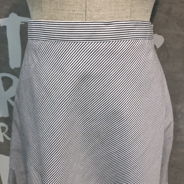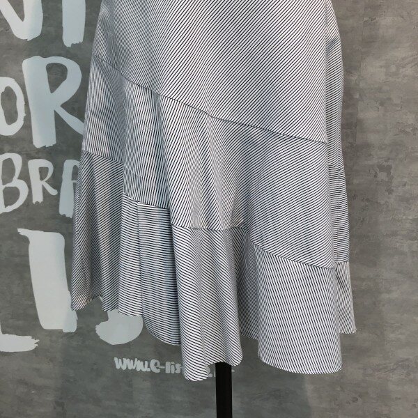 잔잔한 스트라이프 패턴이 포인트되어진 겹단 프릴스커트로 여성스러운 라인이 매력적인 페미닌한 무드의 스커트입디다