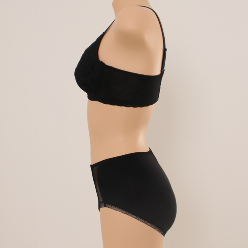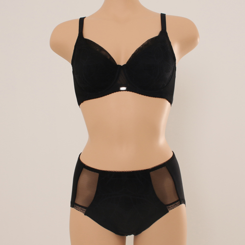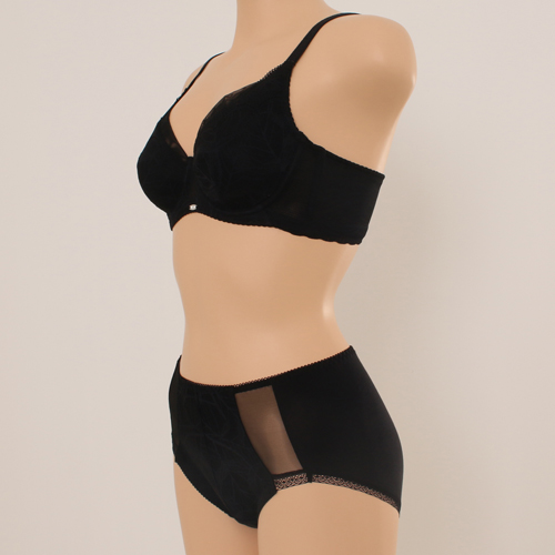 잎사귀 문양이 아치 라인과 세련되게 믹스된 일자 스칼럽의 레이스에 망을 접어 매칭한 디자인의 풀컵 스타일로,부드럽고 편안한 감촉의 사와무라 직조 패드를 3쪽 절 개 방식을 사용하여 가슴을 보다 자연스럽고 입체적으 로 보이도록 설계하였고, 밖으로 드러나는 컵 레이스도 다트 라인을 사용하여 이음선이 도드라지지 않고 매끄 럽게 피트 되도록 하였다.