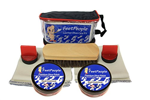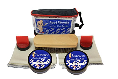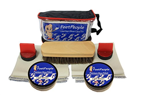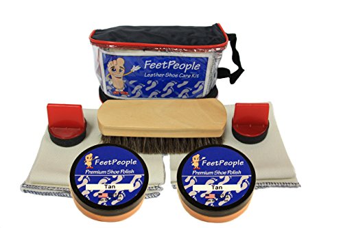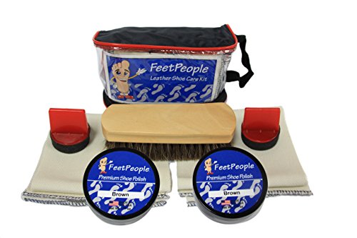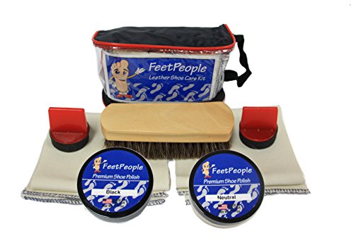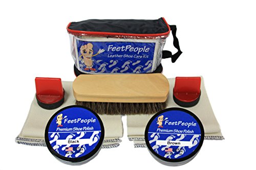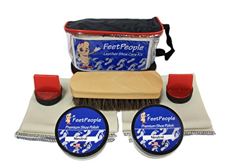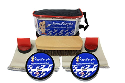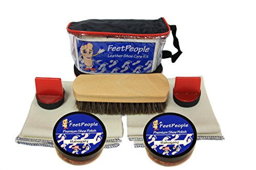 Product Description The FeetPeople Premium Leather Care Kit contains all the things you need to clean, nourish, buff, and shine your shoes. Our kit includes Two jars of our patented shoe polish that is a blend of pure carnauba wax, beeswax and the finest grade of other ingredients. Two FeetPeople Sponge Daubers that allow you to apply paste or cream polish quickly and easily. Keep your hands cleaner and let the applicator apply the polish. One FeetPeople 100% Horsehair Shine Brush has been designed to provide a nice buff finish for your shoes. This shine brush is simply packed with horsehair to make shining those shoes and boots much easier. While most shine brushes have 5 rows of horsehair, this brush has 6 rows, providing even more buffing power. Two Professional Shoe Shine Buffing Cloths to use after you completing apply the shoe polish on the shoe and done with the brushing. Use the shine cloth to obtain that mirror like finish. Our sturdy travel bag is great for keeping your shoe care products safely tucked away along with the giving you the option of taking it with you! 0