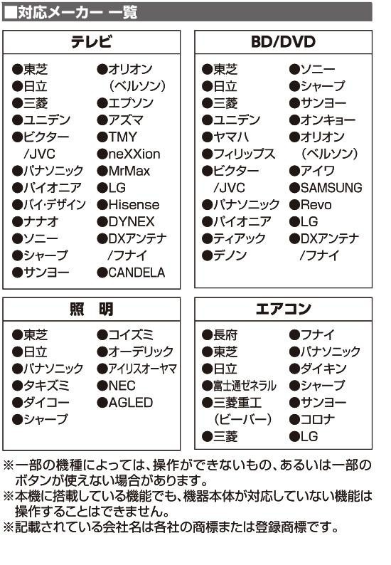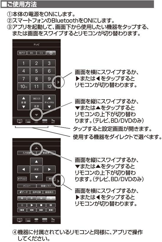 | スマホに専用アプリをダウンロードすることで、テレビ、BD/DVD、照明、エアコン、4つの家電をスマホで操作することができます。45社のリモコン信号をプリセット!初期設定が簡単です。USB、乾電池の2way電源方式。赤外線の届きにくい場所に便利な赤外線延長ケーブル付属。 |