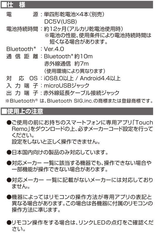 | セット内容 | 本体、microUSB-USBケーブル(約1.2m)、赤外線延長ケーブル(約1m) 、赤外線延長ケーブル用両面テープ1枚、取扱説明書、保証書(保証期間:1年) |
