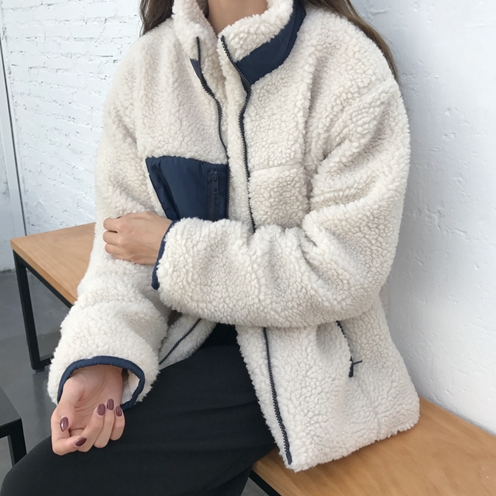ホワイトとネイビーの配色がかわいいボアブルゾン。