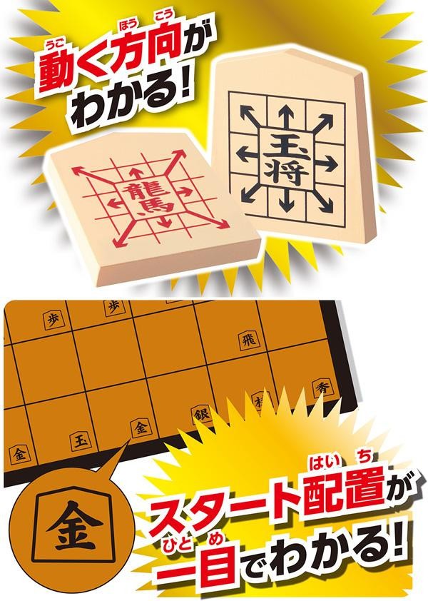 駒の動かし方がわかりやすく描かれているので、はじめてでもすぐに遊べる将棋です。