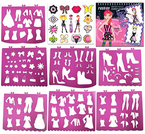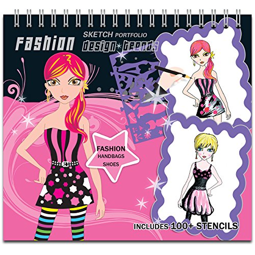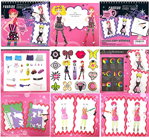 - Over 100+ stencils to dress up the models- 7 Large Stencil Removable Cards - 36 high-quality bond paper fashion design sketch pages with various models to be dressed up- Plenty of Stickers to choose from and dress up the models- High Quality Glittering Front and Back Sturdy Hardcovers- 100+ Large Variety of Accessories Bundle - Shoes, Bags, Dresses, Purses, Rings, Hearts, Diamonds, Butterflies and more- Detailed Simple Instructions