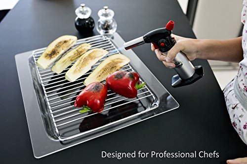 WE BET YOU WON’T FIND A BETTER CULINARY TORCH! Prepare restaurant-quality desserts at home with the Pepe Nero™ Chef's Torch, which is fully equipped with high-end features at a reasonable price. Get precise charring and browning and you'll be proud to serve at your next dinner party. It features an ergonomic handle, a quick-refill design, a safety lock ,and an easy push-button ignition system. It works well when held at any angle. It is a great Kitchen Torch