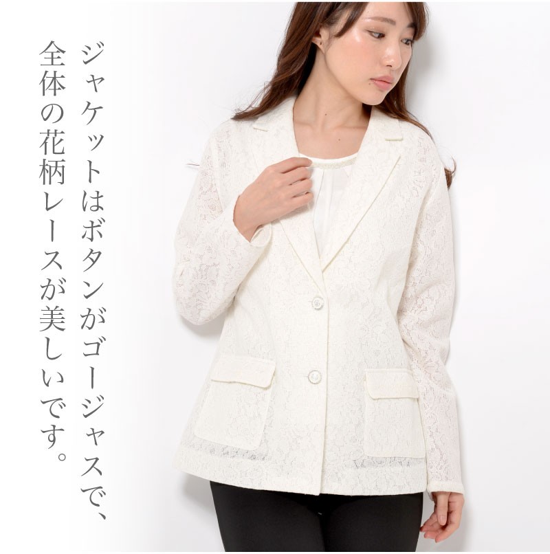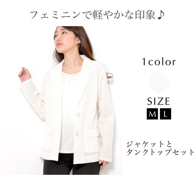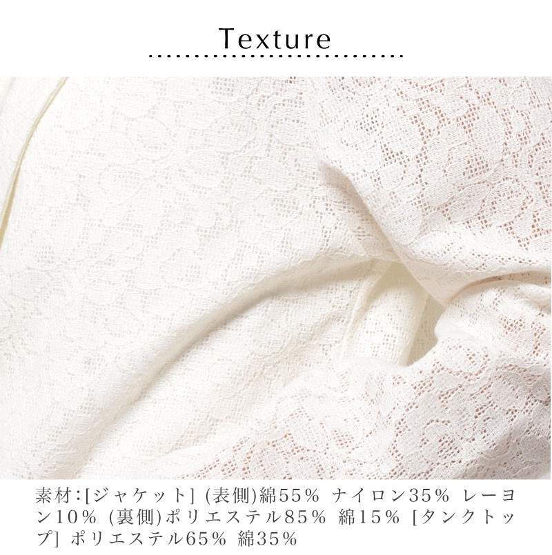 | サイズ | Mサイズ Lサイズ | | 実寸 | 表記は全てcm [ジャケット] [M] バスト98(79-87) 着丈62 袖丈58 肩幅39 [L] バスト104(86-94) 着丈64 袖丈58 肩幅41 [タンクトップ] [M] バスト89(79-87) 身丈60 肩幅34 [L] バスト95(86-94) 身丈62 肩幅36 ※[ジャケット]商品により柄の出方が異なる場合があります。 ●[ジャケット](前)左右ポケット | | 素材 | [ジャケット] (表側)綿55% ナイロン35% レーヨン10% (裏側)ポリエステル85% 綿15% [タンクトップ] ポリエステル65% 綿35% | | 生産国 | 中国 | | 裏地 | あり | | 生地の伸縮 | なし | | 生地の透け感 | なし | | カラー | 01. オフホワイト | | 注意点 | ▼綿混合商品は洗濯時に多少縮む事がございます。 ▼パソコン、モニター等の環境により、実際の商品素材カラーが多少異なる場合が御座います。予めご了承ください。 ▼お手数ですが必ずお買い物ガイドを一読頂いてからご利用いただきますようお願い申し上げます。 | |