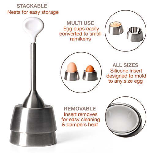 ANY EGG FITS: The neat egg cups come with a silicone insert which serves a dual purpose of insulating the heat of the egg and securing any size egg with the small ridges located on the inside. The silicone insert is removable for easy cleaning.