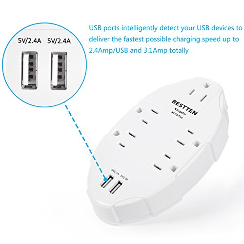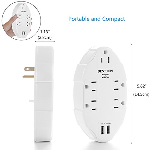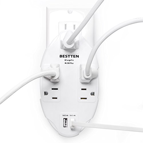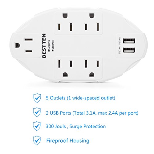 Bestten Wall Outlet Surge Protector with USB Charging, 5 AC Outlets & 2 USB Ports, ETL Certified