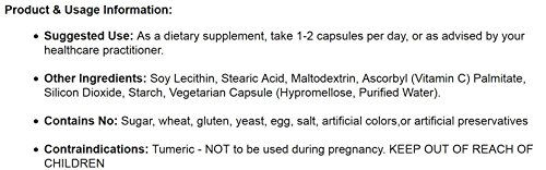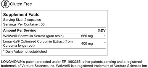 -. Feature : Longvida Optimized Curcumin Extract (from Curcuma longa root) with WokVel Boswellia Serrata (gum resin) / Serving Size: 2 capsules. Servings per Container: 30 / Sested Use: As a dietary supplement, take 1-2 capsules per day, or as advised by your healthcare practitioner. / Sugar free, wheat free, gluten free, yeast free, egg free. / Contains No: salt, artificial colors, or artificial preservatives
