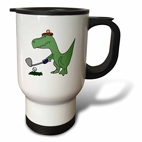 3dRose tm_203784_1 "Funny green Trex Dinosaur Playing Golf Stainless Steel" Travel Mug, 14 oz, Natural