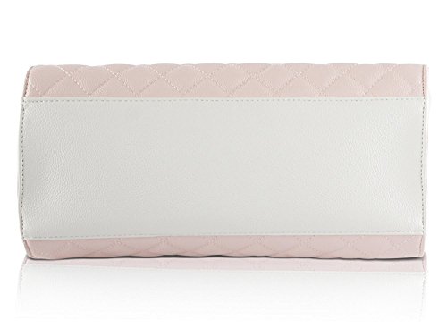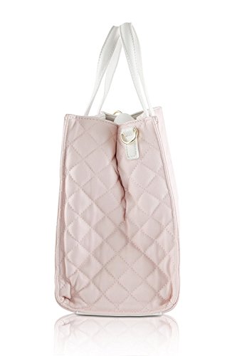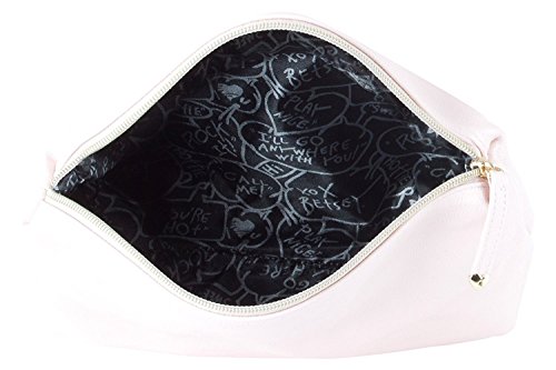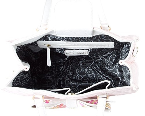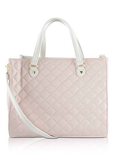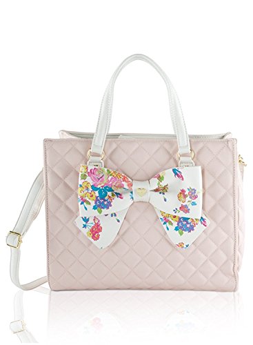 Double the style! with this large tote bag with coordinating pouch. Features quilted pvc exterior, floral front bow with logo plate, duel carrying handles with 6" drop, adjustable removable cross-body strap with 23" drop, Snap closure that opens to fully lined interior with wall zip and 2 slip pockets, complete with a detachable clutch that can be carried on its own or tossed inside the larger bag.Feature