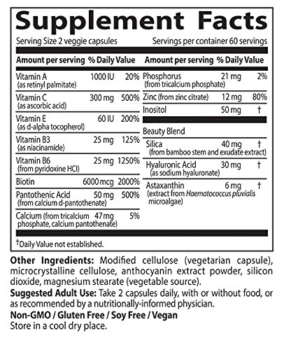 -. Feature : Contains 6,000 mcg of Biotin to help support the overall health of hair, skin and nails / Contains Vitamin C, to help support collagen production / Formulated with vegan Hyaluronic Acid to help support healthy skin / 6mg of natural Astaxanthin help enhance skin elasticity and decrease visible signs of aging / Non-GMO / Gluten Free / Soy Free / Vegan